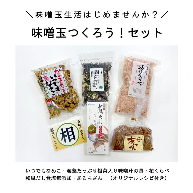 【味噌玉生活はじめませんか?】 味噌玉とは、手づくりインスタント味噌汁のことです。 冷蔵庫で2〜3週間、冷凍で2〜3ヶ月を目安にお召し上がりください。 毎日食べたいと思っていても時間がなかったり、1人分つくるのが面倒だったり、遠のきがちな味噌汁生活が変わります。 味噌・出汁・具材を合わせて丸めておき、お椀やマグカップに入れてお湯を注げば完成。 お好みのトッピングで変化をつけるのもおすすめです。 ゲストハウスモシリパ http://moshiripa.com/ 武重美亜さんのオリジナルレシピつき、あいざわおすすめの逸品でつくる味噌玉づくりセットです。 ◯春駒屋 あるちざん 500g 〇スカイフード 和風だし食塩無添加 4g×8袋 〇海藻たっぷり根菜入り味噌汁の具 21g 〇なめこ屋さんのなんでもなめこ 25g 〇タイコウ 花くらべ 40g 【原材料名】 <春駒屋 あるちざん> 大豆(国産)(遺伝子組み換えでない)、米、食塩 <スカイフード 和風だし食塩無添加> かつお節粉末(国内製造)、甜菜糖、酵母エキス粉末、昆布粉末、椎茸粉末 <海藻たっぷり根菜入り味噌汁の具> 切干大根(宮崎県産)、素干しばらのり(国産)、とろろ昆布(昆布(北海道産)、米酢)、凍り豆腐(大豆(国産))、人参(青森県産)、もずく(沖縄産)、わかめ(三陸産)、椎茸(国産)、ねぎ(国産)/重曹 <なめこ屋さんのなんでもなめこ> 乾燥なめこ(宮城県産)、乾燥わかめ、乾燥ねぎ(国産) <タイコウ 花くらべ> かつおのかれぶし(鹿児島県産製造) 発送温度帯:常温 【ご注文前にご確認ください】 〇複数商品購入時の送料について <弊ショップでは送料がすべて合算される仕様となっております> お選びいただいた商品の温度帯(冷凍・冷蔵・常温)が同一であれば、送料をおまとめすることが可能です。 複数の商品を同一住所にご注文くださるお客さまには、送料をまとめたお客様専用ページを個別にご案内させていただいております。 お手数ですが「Contact」よりご依頼くださいませ。 (ご希望の商品名・お届け先都道府県・お名前をお知らせください) 〇入荷状況により発送に数日お時間をいただく場合がございます。 〇リユースダンボール・発泡スチロールにて発送いたします。 贈り物の場合は別途「ギフト&ラッピング」のご購入をお願いします。 〇当店ではペーパーレス化のため、納品書は発行しておりません。 納品書・領収書をご希望の方は、ご注文の際に備考欄にてお知らせください。 ご贈答用の際も同様に、金額のわかるものは同封いたしません。 〇ご入金確認後の発送とさせていただきます。
