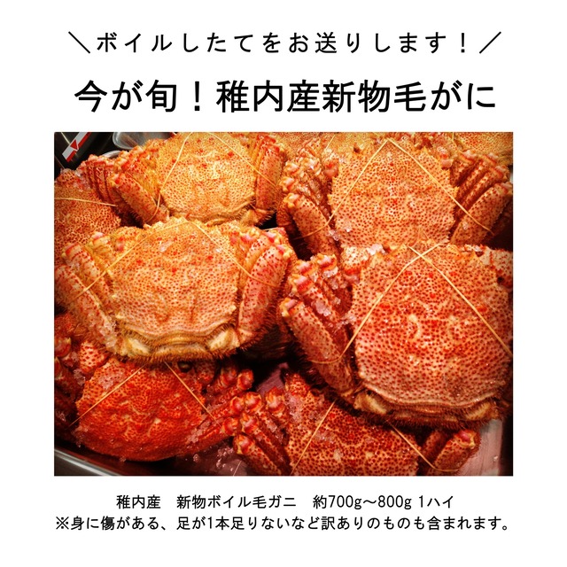 【 今が旬の毛ガニ、ボイルしたてをお送りします! 】 水揚げされたばかりの稚内産毛ガニを、その日のうちにボイル。 ずっしり重たい身入りバツグンの毛ガニを冷蔵便にてお届けします。 身に傷がある、足が1本足りないなど訳ありのものも含まれます。 ご了承くださいませ。 〇稚内産 新物ボイル毛ガニ 約700g~800g 1ハイ (相場によって大きさは多少変動いたします) 〇時化などにより入荷日は未定です。着日指定はお受けできませんのでご了承くださいませ。 〇複数おまとめの購入をご希望の方は別途カートをご用意させていただきますので、お手数ですが「お問い合わせ」よりご依頼くださいませ。 〇リユースダンボール・発泡にて発送いたします。 贈り物の場合は別途「ギフト&ラッピング」のご購入をお願いします。 【送料おまとめ可能です】 複数の商品を同一住所にご注文くださるお客さまには、個別に1件分の送料でお客様専用ページをご案内させていただいております。 お手数ですが「Contact」よりご依頼くださいませ。 (ご希望の商品名・お届け先都道府県・お名前をお知らせください)